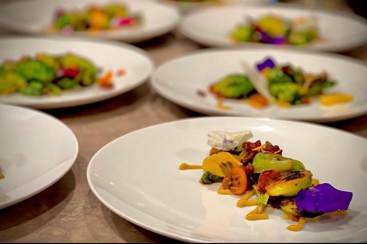 Seared brussel sprouts topped with pancetta, charred kumquat, balsamic aioli and some petals from edible flowers. Kumquat fruits are ready to go when you pluck them off the tree and eat away. The paper-thin skin is where the sugar lies, and there’s virtually no bitter pith. The flesh is extremely, mouth-puckeringly, sour. The seeds, while sometimes a bit crunchy, are small and edible.